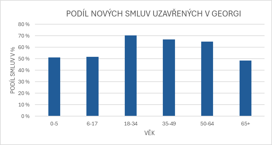 Naštěstí lze sjednat novou smlouvu i všechny změny těch stávajících z pohodlí doma a na pár kliků v Georgi. Počet klientů, kteří tuto službu využívají stále narůstá. Podíl smluv sjednaných v Georgi dosahuje aktuálně v průměru 60 %. V některých věkových kategoriích (18–34 let) dokonce až 70 %. Očekávali jsme, že starší klienti nepodlehnou tomuto novému trendu, ale chyba lávky. Každý druhý klient starší 65 let sjedná smlouvu v Georgi buď sám nebo s pomocí bankéře.